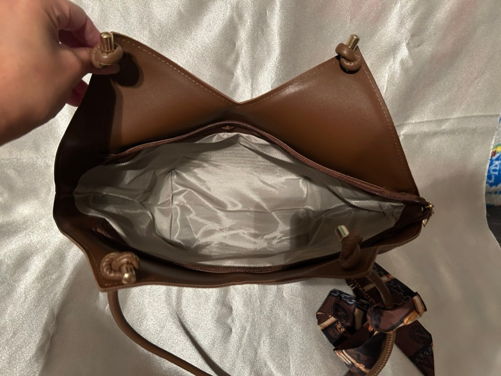 Elevate your ensemble with this medium-sized brown scarf purse, featuring a subtle accent design. Crafted from lightweight fabric, it offers effortless comfort while maintaining a refined look. The secure zipper closure ensures your essentials stay safely tucked away, making it a perfect blend of style and practicality for any occasion.
