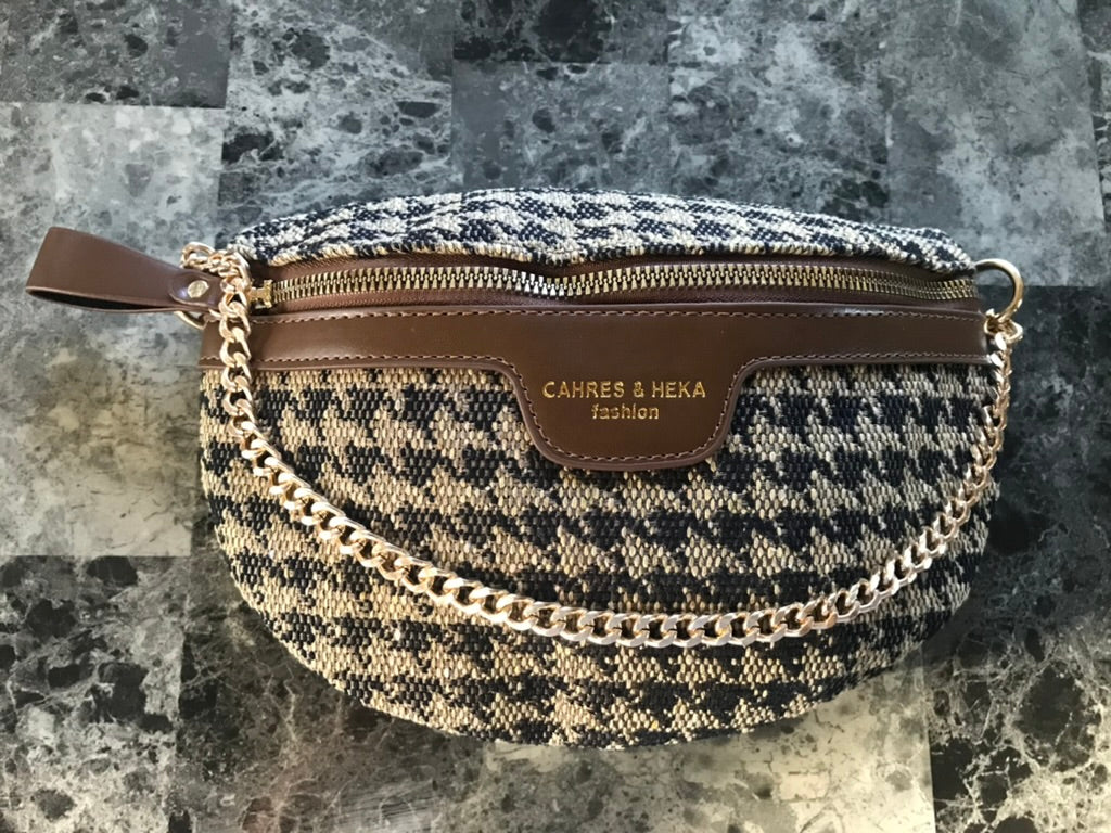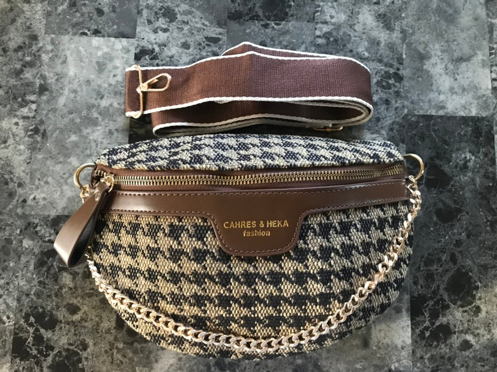 Elevate your style with the Classy Fanny Purse, featuring a bold brown checker pattern that commands attention. This daring accessory combines the convenience of a fanny pack with the elegance of a purse, enhanced by an eye-catching accent chain for a touch of edge. Perfect for those who want to stand out while keeping essentials close and hands-free.