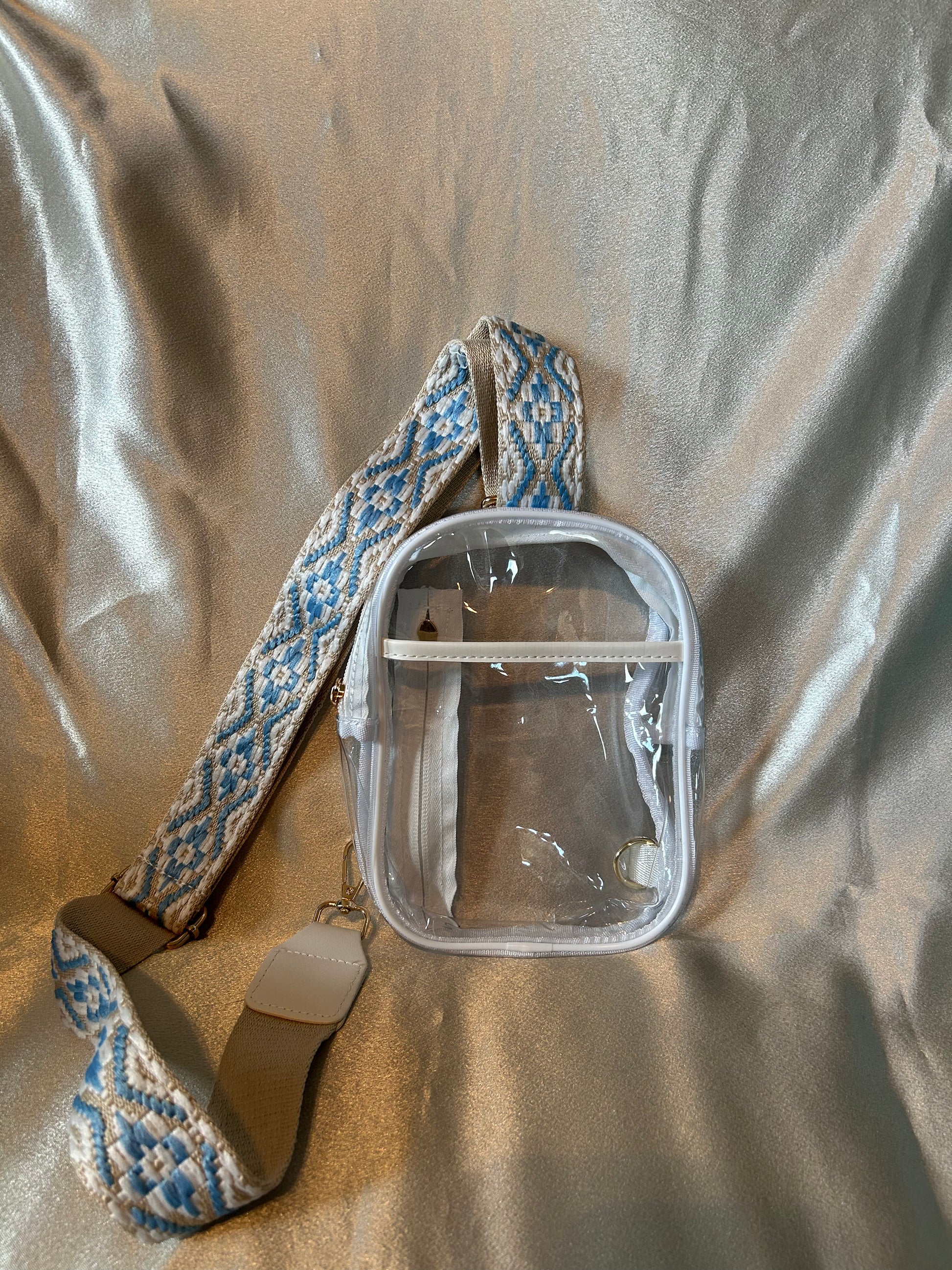Stay stylish and hands-free with the Clear Cross Body purse! Featuring a cheerful light blue and white chevron pattern with crisp white trim, this playful accessory keeps your essentials close and secure. Easily access your belongings through the convenient zipper on the back or top, perfect for on-the-go fun without missing a beat.