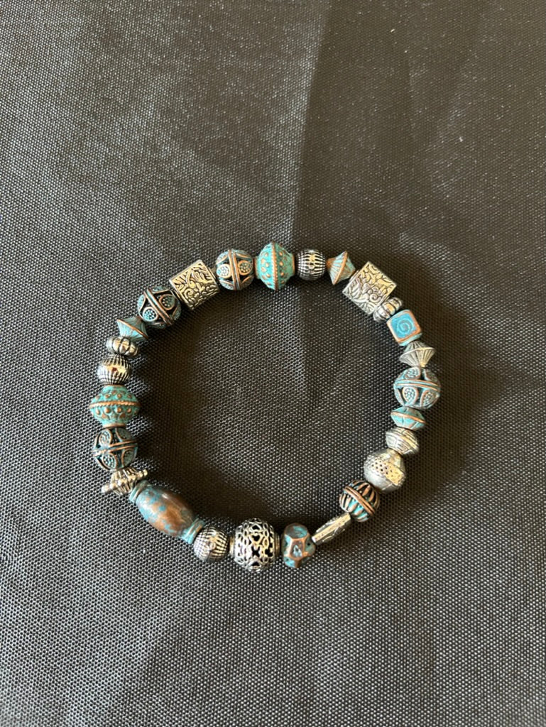 The Roman Gem Bracelet combines the cool elegance of turquoise with polished silver, showcasing whimsical shapes and patterns that add a unique, artistic flair. This refined piece enhances any outfit with a subtle yet sophisticated charm.