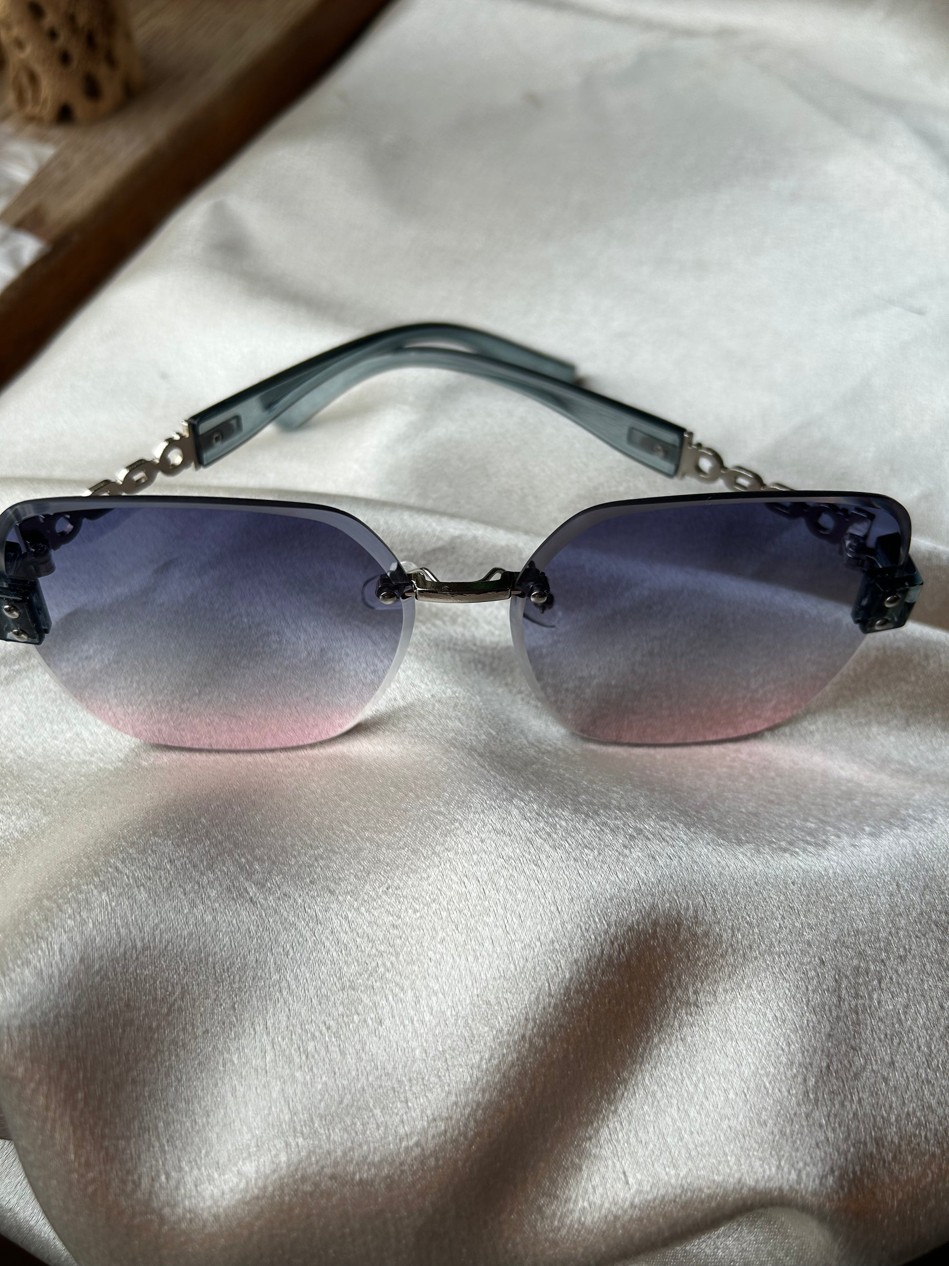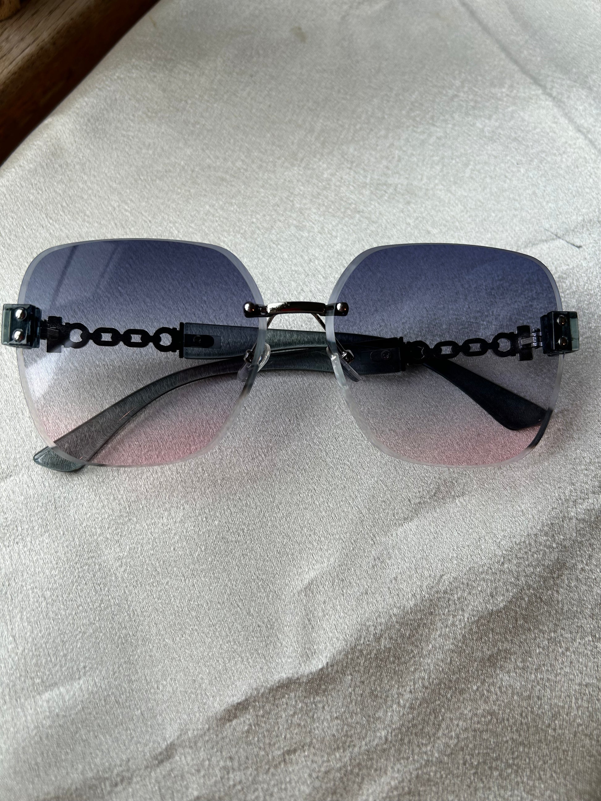 Elevate your summer style with these elegant sunglasses featuring pink and purple tented lenses that offer a subtle, chic tint. The distinctive chain-style handles add a refined touch, blending fashion with sophistication for any sunny occasion.